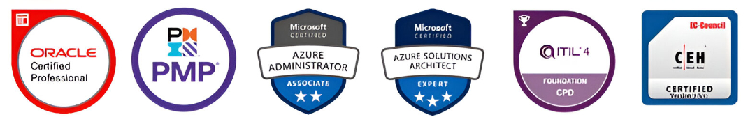 Oracle Certified Professional    |    Project Management Professional    |    Microsoft Azure Administrator Associate    |    Microsoft Azure Solution Architect    |    Certified Eithical Hacker